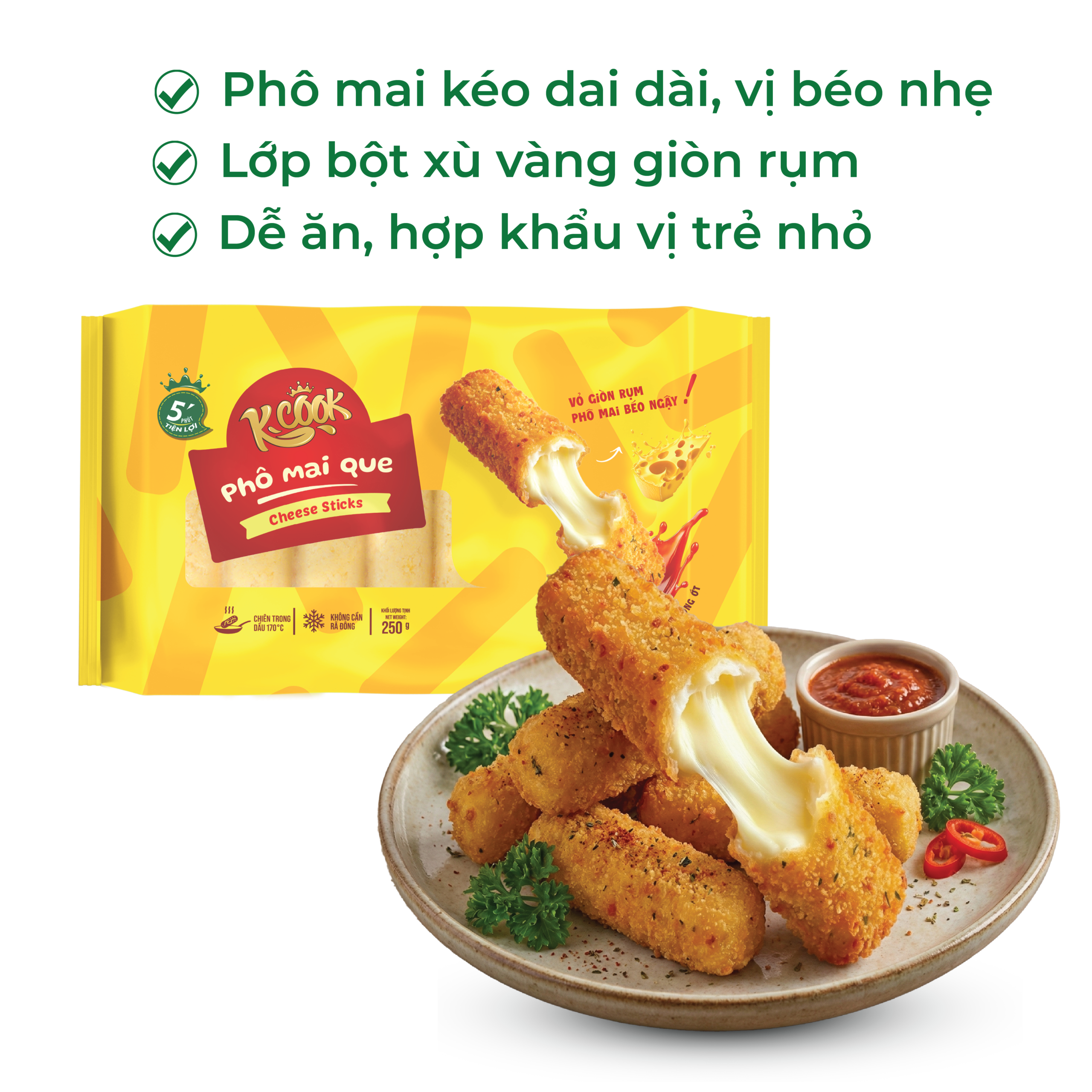 Từng que không dính nhau, dễ lấy ra, chiên lên không bị bể hay xì phô mai, vị béo nhẹ dễ ăn với người lớn