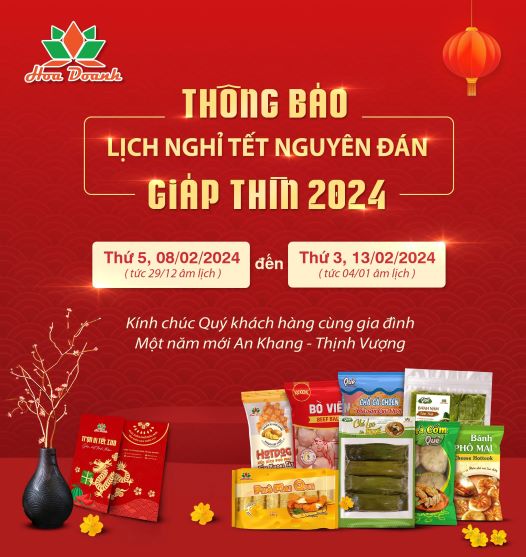 HOA DOANH FOODS xin trân trọng kính gửi đến Quý đối tác, Quý khách hàng thời gian nghỉ Tết Nguyên Đán 2024 như sau: